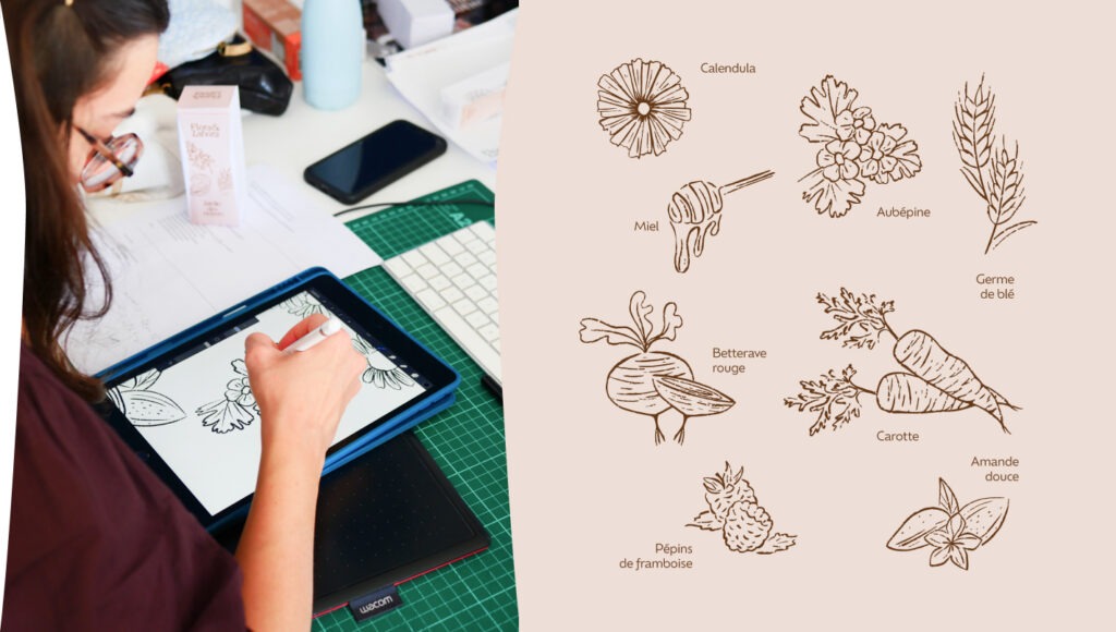 Les choix de matériaux (bois, verre, papiers naturels) s’imposent avec évidence. Les boîtages, inspirés de la forme du scapulaire, le vêtement des soeurs, deviennent des objets porteurs de sens, à la fois protecteurs et symboliques. Chaque détail raconte une vie simple, rythmée par le travail, la prière et le soin apporté aux autres. L’illustration, dessinée à la main, met en lumière les ingrédients principaux. Elle célèbre la plante, la terre et le temps long, tout en apportant une lecture douce et pédagogique de la composition des produits.
