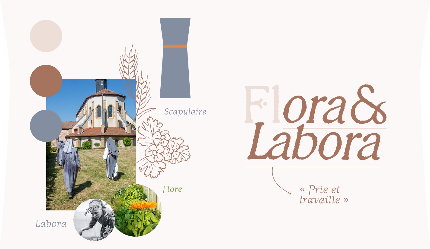Flora et Labora s’inscrit dans l’héritage de la devise bénédictine Ora et Labora (« prie et travaille« ) qui rythme la vie des sœurs du monastère de Chambarand. Confectionnées au fil des prières et des saisons, les huiles de soin prennent naissance dans le jardin du monastère, dans un rapport humble et attentif au vivant. Notre travail a consisté à traduire cette philosophie en une identité de marque juste et sensible, loin des codes artificiels de la cosmétique industrielle. Ici, le geste prime sur le discours, l’essentiel sur le superflu.